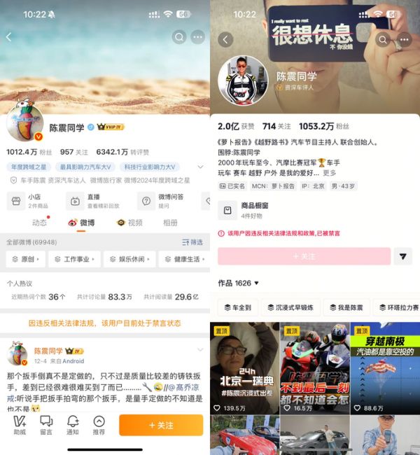 12 月 22 日消息,小雷发现,车圈顶流陈震的部分社交媒体账号已被解封。