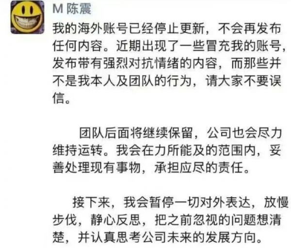 12 月 6 日,网友们发现他开始更新海外社交媒体账号。到了 12 月 7 日,陈震在朋友圈发了条声明,说自己的海外账号已经全面停更,后续不会再发布任何内容。