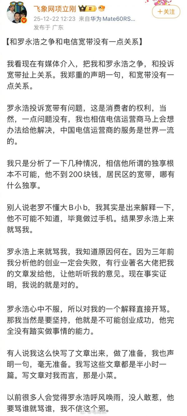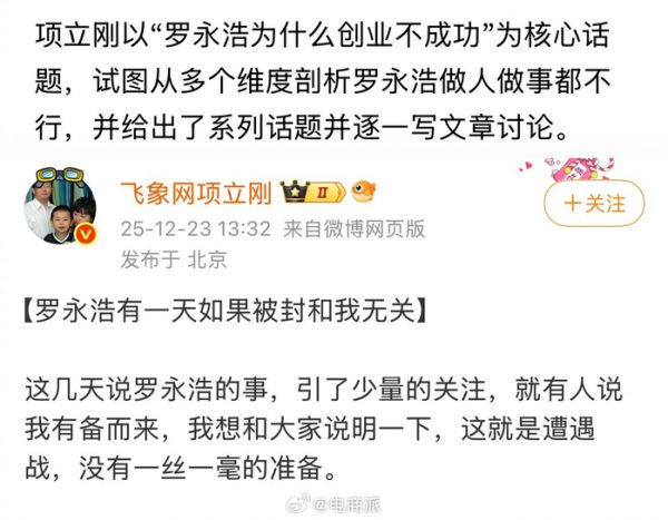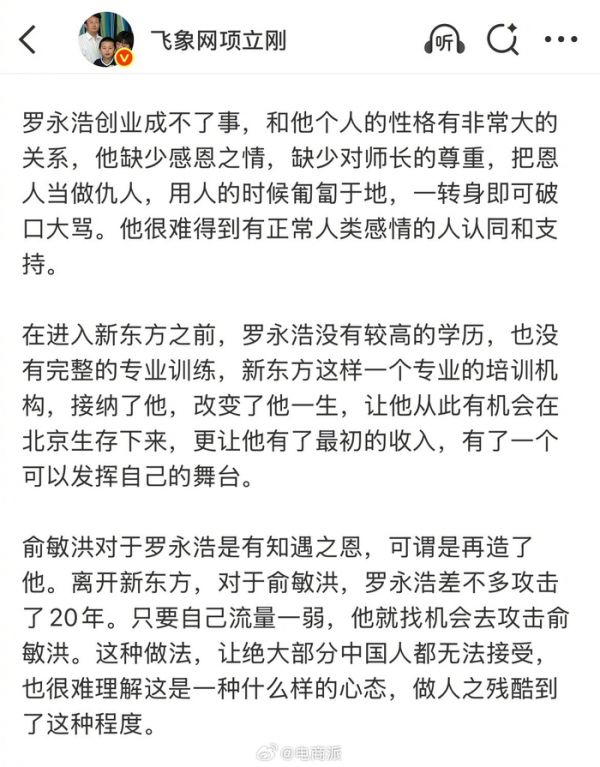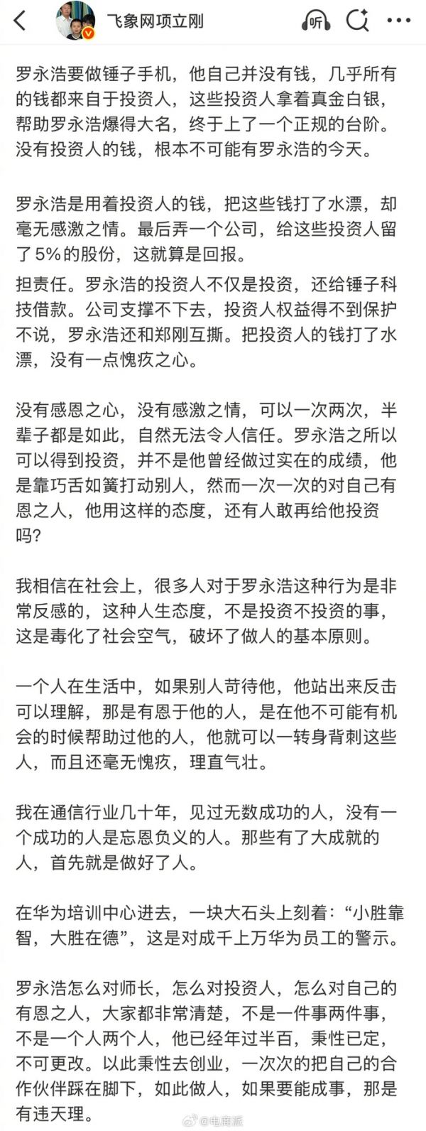 项立刚斥罗永浩忘恩负义,称俞敏洪遭其攻击20年