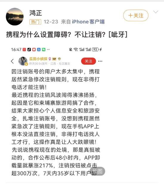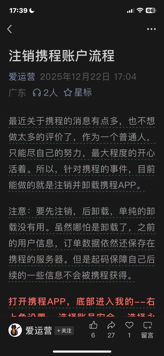 而当用户决心离开时,却发现“分手”也不容易,法律说“注销应当便捷”,现实却给你设下重重关卡。网上设置有注销携程的教程: