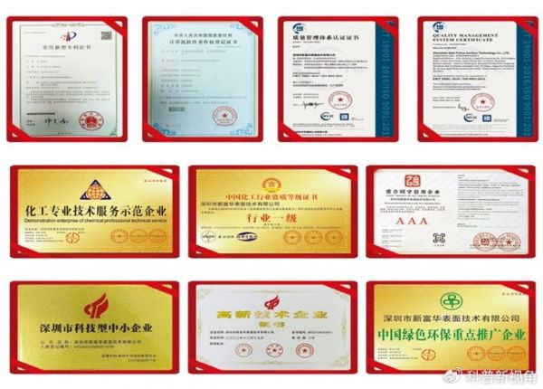 多年来的专注与投入,使新富华在技术研发、产品质量与市场服务方面屡获认可。公司先后荣获“国家级高新技术企业”认证,标志着其研发创新体系与核心技术能力达到了国家层面标准。同时,多项产品工艺通过SGS、RoHS、REACH等国际权威检测与认证,确保符合全球主要市场的环保法规要求,为客户的产品的安全出口与绿色竞争力提供了坚实保障。公司亦被行业及客户多次评为“优秀供应商”与“技术创新企业”,这些荣誉是新富华坚持品质、深耕服务、持续创新的最佳注脚。