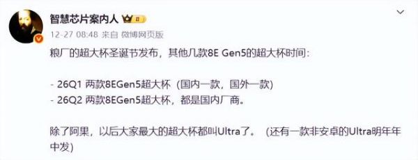 数码博主“智慧芯片案内人”透露,2026年第一季度将有两款搭载第五代骁龙8至尊版的超大杯机型亮相,一款面向国内,一款主打海外;第二季度还有两款国内厂商的机型发布。更值得注意的是,除了苹果,各大品牌的超大杯都将统一命名为“Ultra”,比如iQOO 15 Ultra可能在春节前上市。