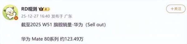 数码博主“RD观测”的数据显示,截至2025年第51周,华为Mate80系列销量约123.49万台——这意味着上市仅23天,就实现了“百万级”的突破。更值得注意的是,这款机型的出货结构里,标准版占比最大,Pro Max、Pro和非凡大师版本仍需抢购,甚至出现市场溢价。