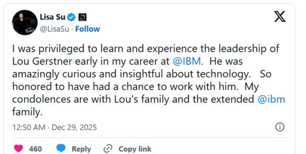 IBM 现任董事长兼 CEO 阿尔温德·克里希纳(Arvind Krishna)在悼念信中写道,郭士纳在 IBM 前途未卜的时刻临时上任,其领导力源于对客户未来需求坚持不懈的专注。作为一名前 IBMer,AMD 董事长兼 CEO 苏姿丰在社交媒体上写道:“我有幸在自己在 IBM 的职业生涯早期见识并体验了路易斯·郭士纳的领导力。他对技术有着惊人的好奇心和深刻的洞察力。能有机会与他共事,我倍感荣幸。我向郭士纳的家人和 IBM 大家庭致以深切慰问。”
