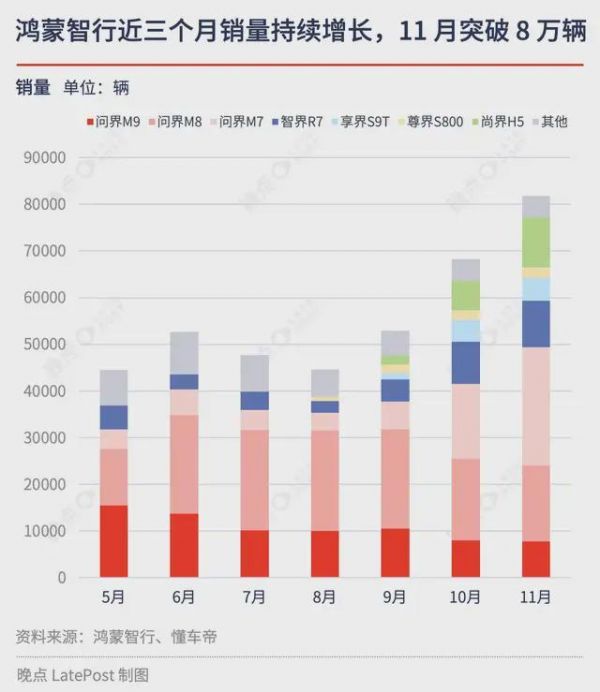 问界之外,定位入门级市场的尚界,在 11 月单月交付超 1 万辆;智界则面向年轻群体,月交付量连续两个月破万;享界 S9 系列成为售价 30 万元级新能源豪华轿车销量冠军;尊界 S800 连续三个月位居 70 万元以上豪华轿车销量第一。