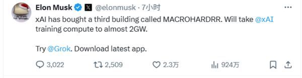 马斯克加码xAI算力:收购新大楼,冲刺2吉瓦训练规模
