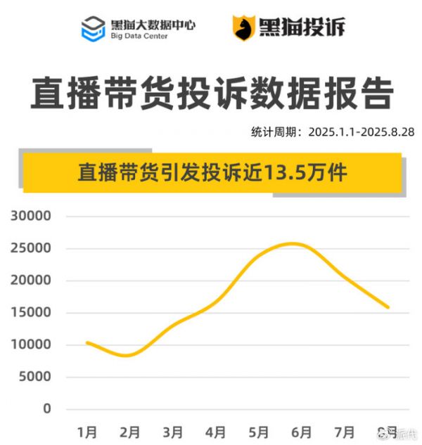 根据黑猫大数据中心发布《直播带货投诉数据报告》,2025年前八月,黑猫投诉平台累计收到直播带货相关投诉近13.5万件,行业问题越来越突出。