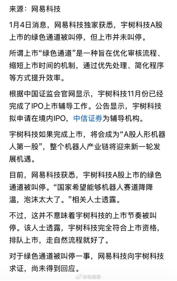 #宇树科技上市绿色通道被叫停# 机器人赛道要降降温?曝宇树科技上市绿色通道被叫停。