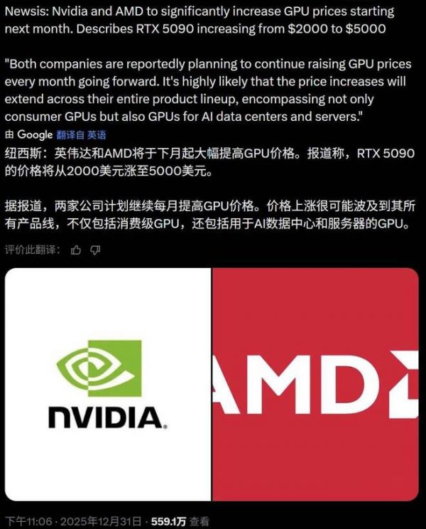 英伟达、AMD本月起或涨价,5090两千美元变五千