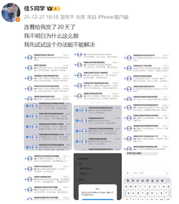 郝佳在2025年12月27日首次披露遭受短信轰炸骚扰,当时她发文称:“连着给我发了20天了,我不明白为什么这么做,我先试试这个办法能不能解决”。然而她尝试的方法并未奏效。从公布的截图可以看到,她的手机在短时间内收到了来自各种平台的验证码短信,包括“美团”、“快手”、“京东秒送”、“浙里办”等。这种“短信轰炸”是通过自动化工具向特定手机号集中发送大量验证码短信,以达到骚扰目的的行为。在1月2日的发文中,郝佳直接向骚扰者喊话:“如果你能看见我发的,拜托你心底善良一点!”但骚扰者并未停止,从2025年持续至2026年。