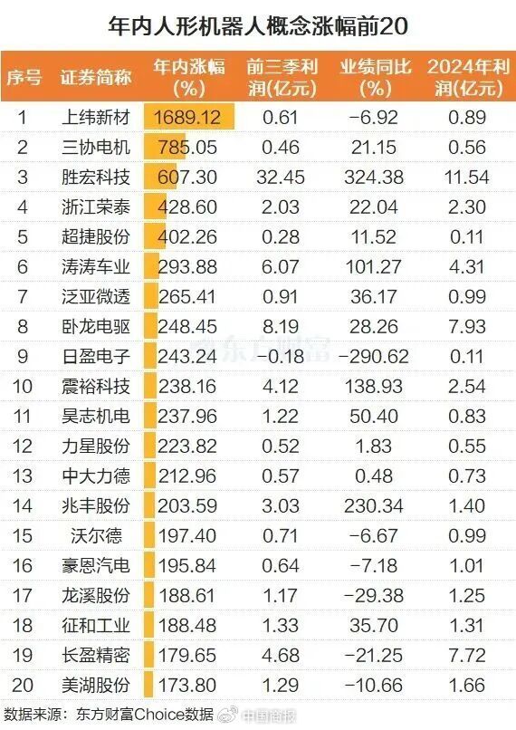 人形机器人概念2025年也表现强势。对于个股而言,上纬新材年内上涨1689.12%,暂居年内A股“涨幅王”的位置。年内上市新股三协电机紧随其后,年内涨幅785.05%。胜宏科技、浙江荣泰、超捷股份等也涨幅靠前。从整体而言,人形机器人概念板块,年内有109股涨超50%,47股股价翻倍,个股上涨中位数为50.76%。