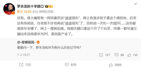 最近,有网友在微博上提问,“偷偷问一下,罗永浩和华为有什么历史过节吗?”对此,当事人罗永浩转发网友微博,并回应道,“没有。是大嘴哥(指余承东)有一阵特喜欢讲‘遥遥领先’,网上有很多段子拿这个调侃他,后来还有传闻说,任老板不许他再说‘遥遥领先’了,否则说一次扣一次钱......”
