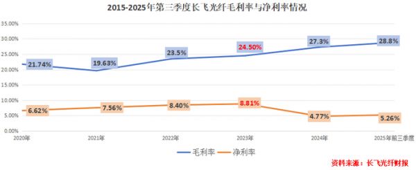 2025年前三季度,长飞光纤营收102.75亿元,同比增长18.18%;然而净利润则只有4.7亿元,同比下降18.02%。