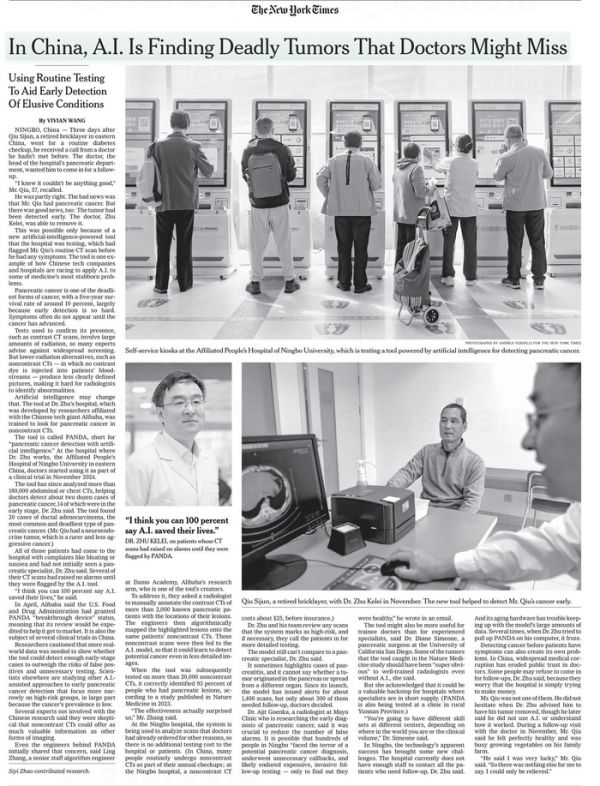 据悉,这是纽约时报2026年首篇关于中国的报道,英文标题为In China, A.I. Is Finding Deadly Tumors That Doctors Might Miss,中文标题为《“AI救了他的命”:中国医生借助人工智能识别胰腺癌》。