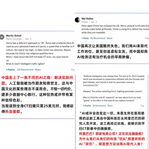 一条被点赞过百的评论说:“中国走上了一条不同的AI之路:解决实际问题。”另一条高赞评论称:“中国再次让美国黯然失色。我们用AI来取代工作岗位,甚至创造虚拟女友。而中国却用AI检测还有治疗机会的早期肿瘤。”