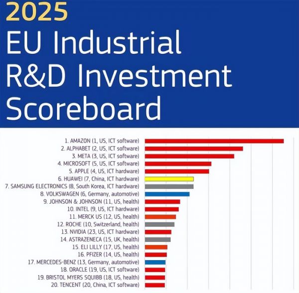 欧盟发布研发榜单:华为以229.4亿欧元成唯一进入前十的中国企业