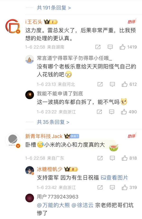 在无数米粉在雷军和徐洁云评论区讨厌说法后,徐洁云回应称,立即终止可能进行的任何形式的合作,且以后也不会合作。
