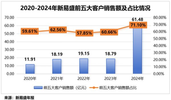 以2024年为例,公司前五大客户的销售额达61.48亿元,占总营收的71.1%。其中,第一大客户的销售额占比就高达31.74%。