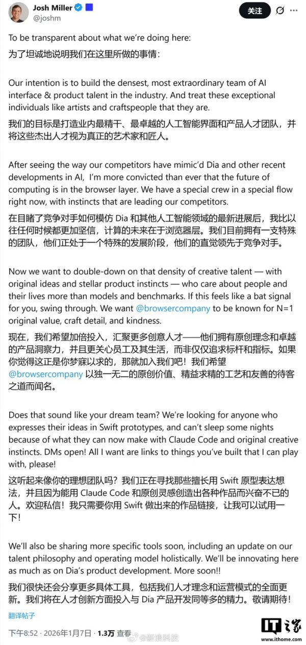 Miller 在随后的帖文中进一步阐述了公司的战略野心,宣称今年“大展拳脚”(not messing around)。他表示,公司致力于组建一支由顶尖 AI 交互与产品人才组成的团队,并将这些杰出个人视为“艺术家和工匠”。
