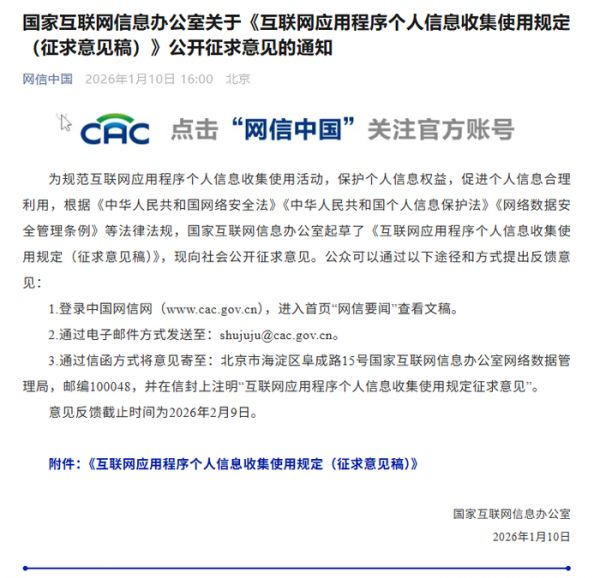 红星资本局1月10日消息,今日,据“网信中国”消息,为规范互联网应用程序个人信息收集使用活动,保护个人信息权益,促进个人信息合理利用,国家互联网信息办公室起草了《互联网应用程序个人信息收集使用规定(征求意见稿)》,现向社会公开征求意见。意见反馈截止时间为2026年2月9日。