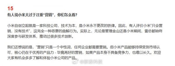 小米强调:“自从创立起就是一家科技公司,技术为本,是小米永不更改的铁律。因此,有人评价小米‘只会营销,没有技术’,这完全一种恶意的曲解行为。”