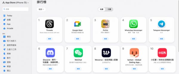 在“禁令”出台后,反而吸引了更多岛内用户下载小红书。一个月过去,1月10日,小红书在台湾的安卓(Google Play)应用商店下载量超过1000万次。在台湾地区的苹果应用商店,小红书也保持在社交领域排行榜的第10名。