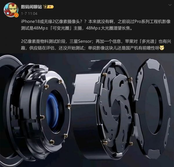 与此同时,博主@数码闲聊站也表示,iPhone 18系列本来就没有2亿像素摄像头,该方案还停留在物料测试阶段。