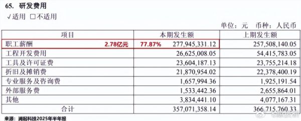 数据显示,2025年上半年,公司研发费用为3.57亿元,占营业收入的比例为13.56%。其中,“职工薪酬”高达2.78亿元,占比高达77.87%。