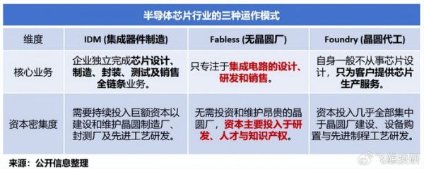 目前,半导体芯片行业主要存在IDM(集成器件制造)、Fabless(无晶圆)和Foundry(晶圆代工)三种运作模式。