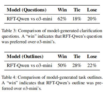 图丨评估框架下的实验结果(来源:EMNLP)研究结果显示,经过该方法微调的 Qwen-2.5-7B 模型,在自动评估指标上比基线模型 o3-mini 提高了 18%;而在人类评估中,基于该方法生成的澄清问题以及最终大纲分别获得 42% 和 28% 的偏好率。