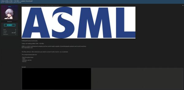 近日,一名昵称为“1011”的黑客在暗网论坛上发帖声称自己成功入侵了荷兰光刻机巨头ASML的系统,并窃取了154个数据库,其中包含大量敏感公司信息,引起关注。而ASML官方已于当地时间7日发声辟谣。
