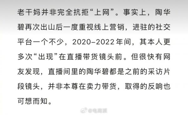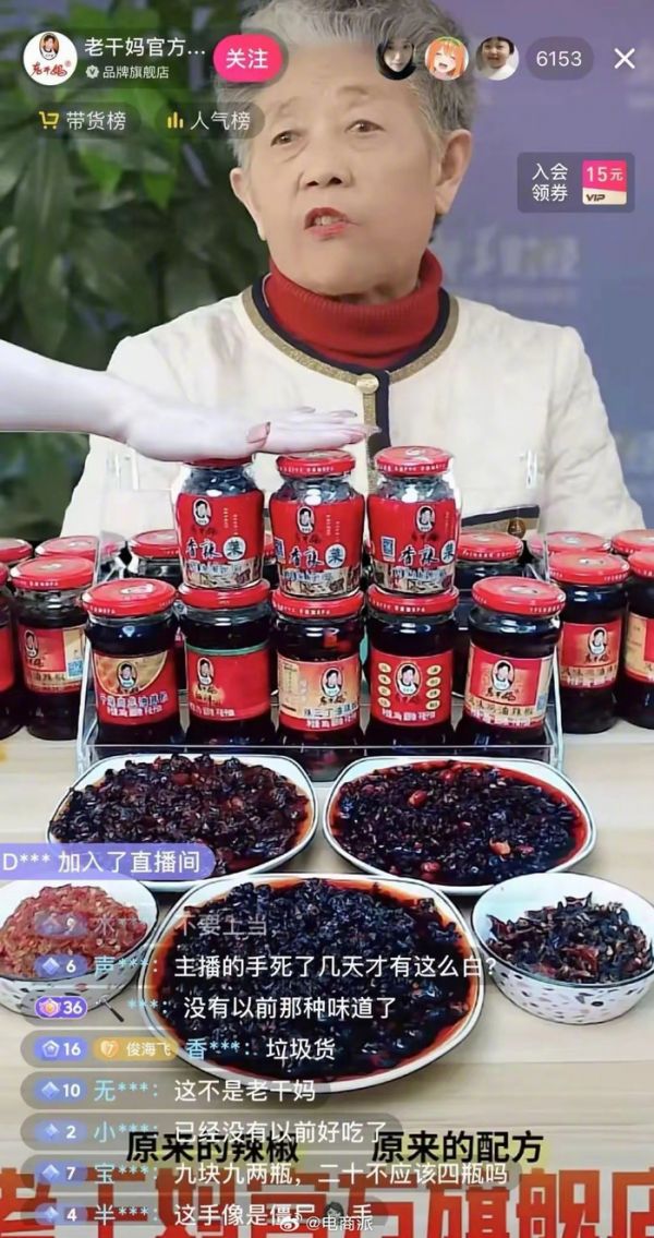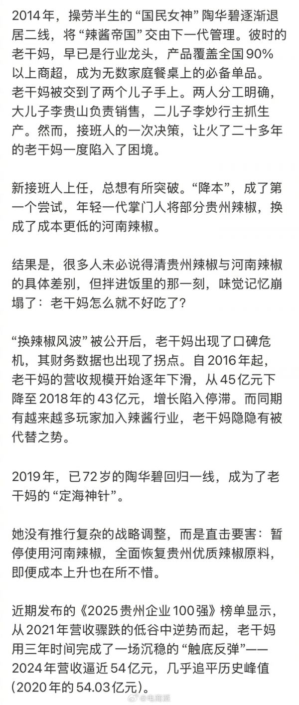 #老干妈创始人出山救子又赚翻了# 曾用创始人陶碧华采访画面直播带货翻车,重回巅峰的老干妈卖了54亿,官方账号又恢复更新了。