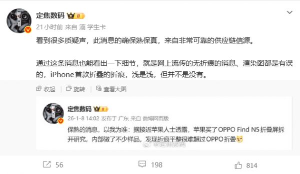 日前,微博粉丝超240万的博主@定焦数码 爆料称,为开发首款折叠屏iPhone,苹果购买了国产竞品OPPO的Find N5并进行了拆解。该博主爆料称,苹果内部做了不少样品。