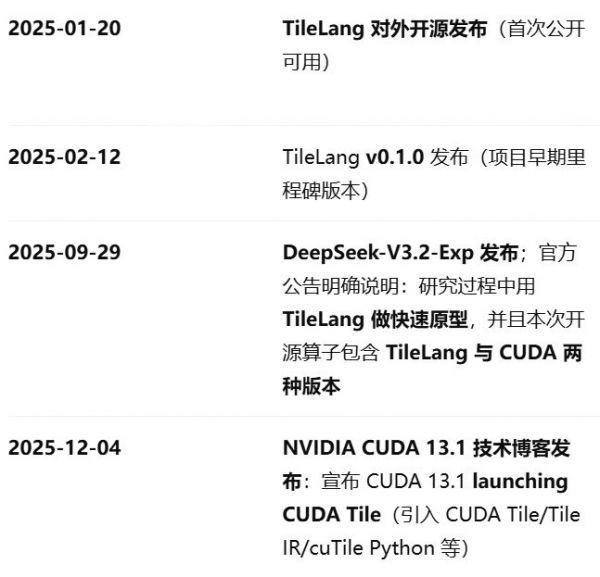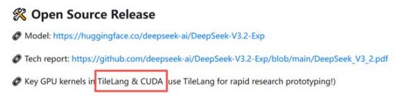 并且前段时间 DeepSeek 发布 V3.2 的时候,真的同步发布了两个版本 —— 一个 CUDA 语言构建的版本,一个 TileLang 语言构建的版本。