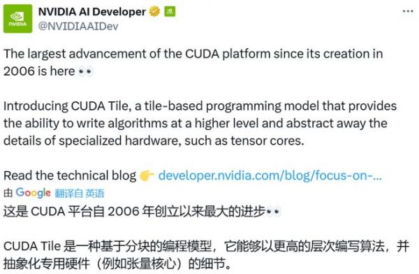 事情是这样的,上个月初英伟达毫无征兆地推出了一个叫 CUDA Tile 的 GPU 编程语言,直接让圈里人炸锅了。因为官方是这么形容这次更新的,“这是自 2006 年 CUDA 发布以来,最大的一次进步”。