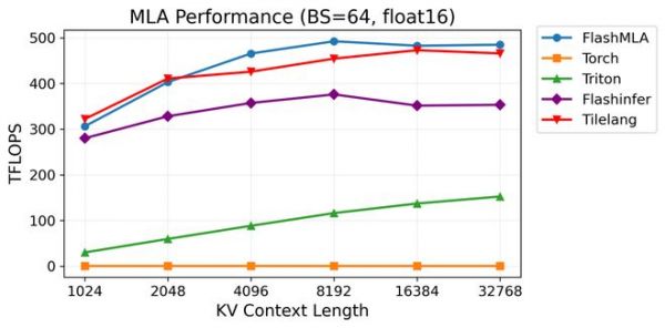 在 H100 显卡上,计算 MLA 算子,TileLang 性能接近目前最快的 FlashMLA