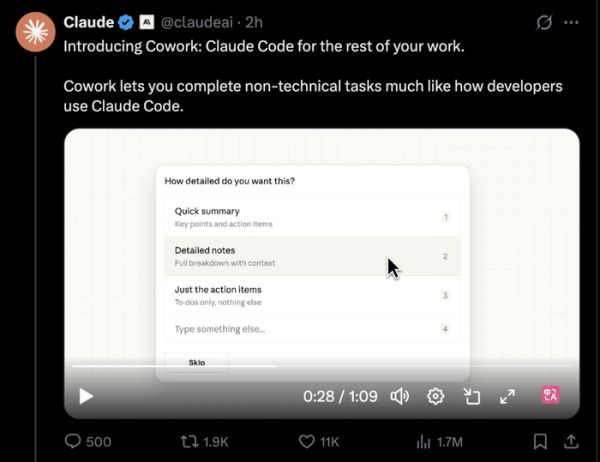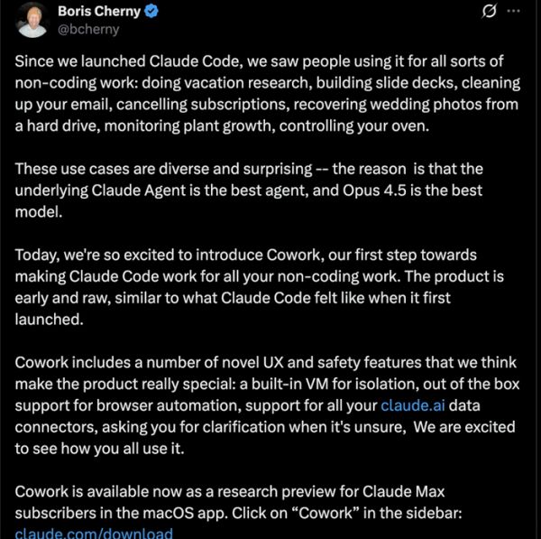 在 Cowork 发布之后,迅速在开发者社区、AI 产品圈以及更广泛的知识工作者群体中引发讨论。与以往单纯围绕模型能力、跑分或价格的争论不同,这一次的焦点明显转向了一个更现实的问题:“AI 是否真的开始成为一个可以被信任、被授权的工作参与者?”