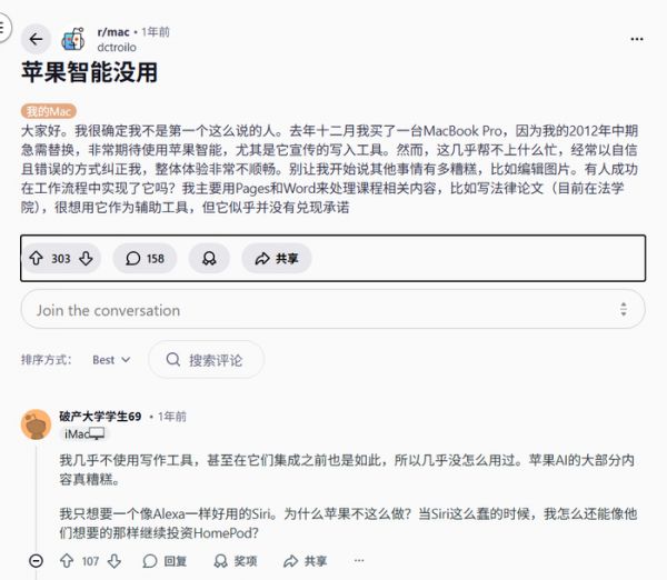 (图源:Reddit)我看了一下,老外对Siri的不满主要集中在准确度差、功能有限,AIGC体验令人失望上,就像上面这种帖子,在国外贴吧Reddit里起码有成百上千条,随随便便都能骗到三百多赞,你就知道有多少老外在共鸣了。