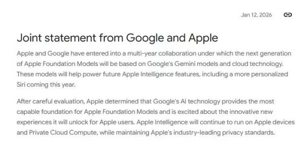 根据苹果与谷歌公布的联合声明,双方将共同推动下一代“苹果牌AI”的发展。苹果未来的基础AI模型将基于谷歌的Gemini及其云技术打造,并将用于支持包括全新个性化Siri在内的多项Apple Intelligence功能。
