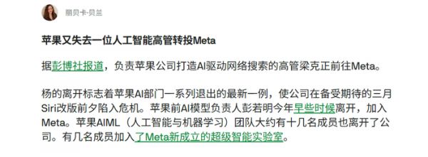 这几年,苹果的AI高管和核心工程师,被OpenAI、谷歌和Meta轮番挖角,像挖墙脚一样,一挖就是一大批,哪怕是刚刚升级为团队负责人的高管,下一秒也可能出现在Meta的办公室里。