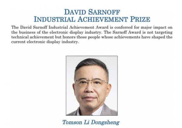 2021年,李东生获得SID颁发的David Sarnoff产业成就奖