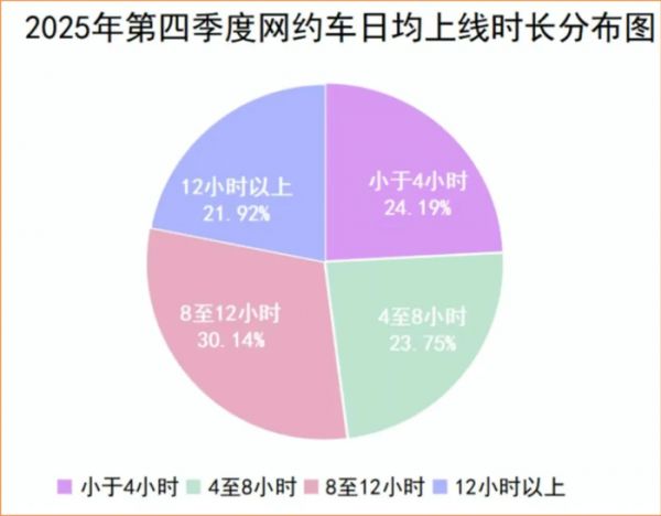 按上线时长分析,小于4小时的有2.25万辆,占比24.19%;4至8小时的有2.21万辆,占比23.75%;8至12小时的有2.81万辆,占比30.14%;12小时以上的有2.04万辆,占比21.92%。