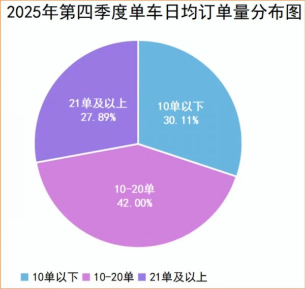 从单车日均订单数量分布来看,少于10单的有2.8万辆车,占比30.11%;10至20单区间的有3.91万辆车,占比42%;21单及以上的有2.6万辆车,占比27.89%。