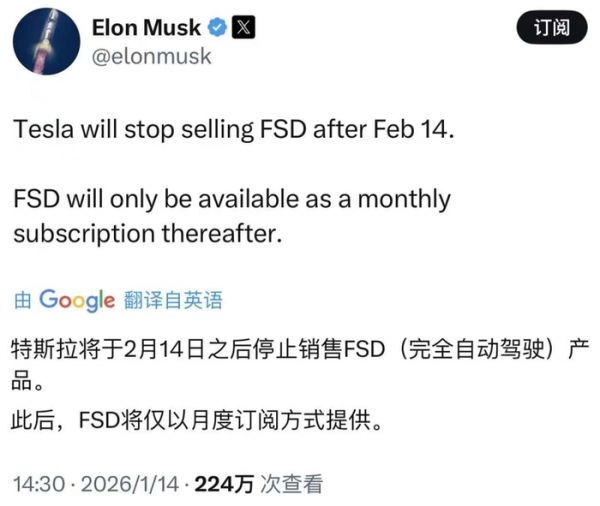电动知家消息,北京时间1月14日下午,特斯拉CEO埃隆·马斯克在社交媒体平台X上宣布,特斯拉将在2026年2月14日后,正式停止全自动驾驶(FSD)功能的“买断”销售。此后,FSD将仅以月度订阅的形式向用户提供。