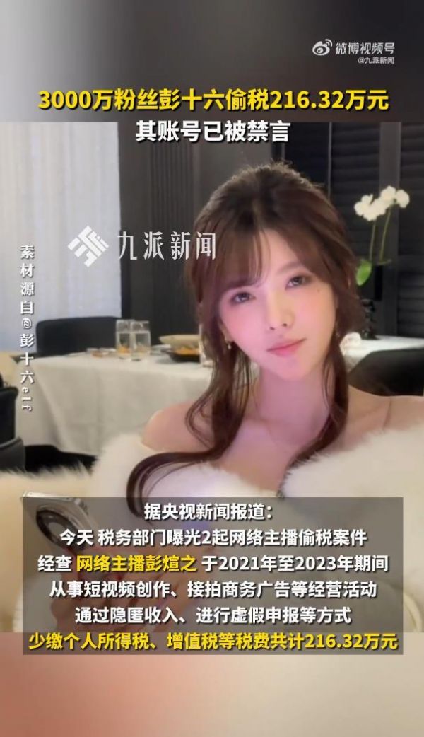 千万网红彭十六被曝偷税,相关账号已遭全平台禁言