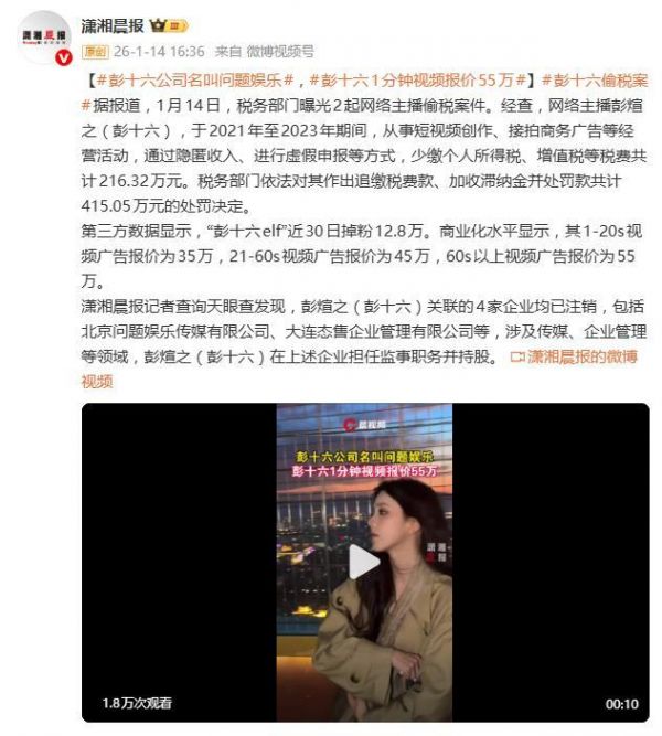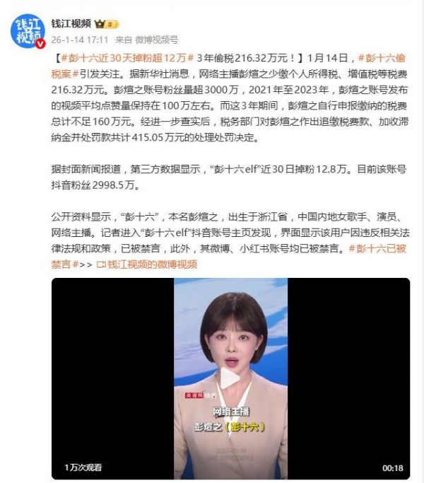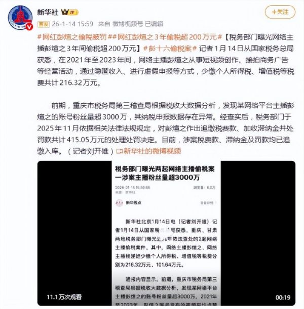 一纸税务通报,让坐拥三千万粉丝的网红“彭十六”彻底翻了车。1月14日,国家税务总局曝光的两起网络主播偷税案中,彭十六(本名彭煊之)因少缴税款216.32万元被追缴罚款合计超415万元,相关账号随即遭全平台禁言,瞬间从流量巅峰跌入“社会性死亡”。