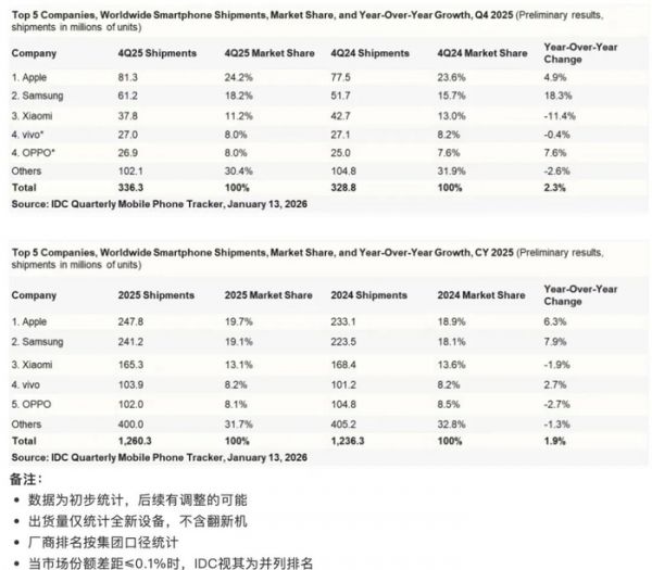 至于全球市场,IDC统计的2025Q4和2025全年数据参考上图,全年来看,全球市场份额TOP5依次是:❶苹果(19.7%份额)❷三星(19.1%)❸小米(13.1%)❹vivo(8.2%)❺OPPO(8.1%),其它品牌合计约31.7%。和前几日另一家机构Counterpoint统计的排名一致。