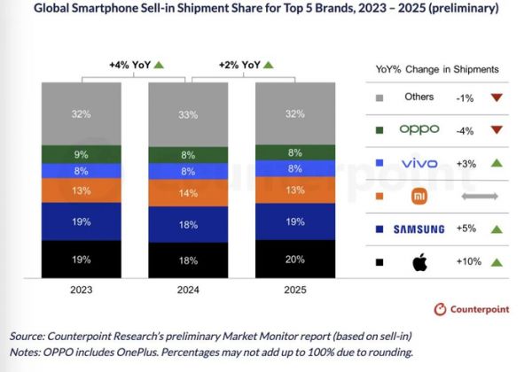 上图为Counterpoint统计的2025全球市场份额细节上需要补充的是,IDC数据无特别标注的话,一般默认vivo包含iQOO,小米包含REDMI红米,OPPO一般默认包含一加不含realme真我,数据为初版,存在变化可能,仅供参考。