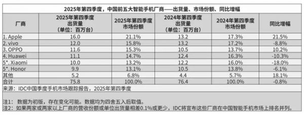 首先来看看IDC更新的2025Q4(10-12月)中国智能手机市场出货量排名情况,TOP6初步份额依次是❶苹果 约1600万台,21.1%份额,同比增长21.5%;❷vivo 约1200万台,15.8%份额,同比下滑8.8%;❸OPPO 约1160万台,15.3%份额,同比增长10.2%;❹华为 约1110万台,14.7%份额,同比下滑10.3%;❺小米 约1000万台,13.2%份额,同比下滑18%;❻荣耀 约990万台,13.1%份额,同比下滑6.1%;其它品牌合计约520万台,6.8%市占率,同比增长18.1%。