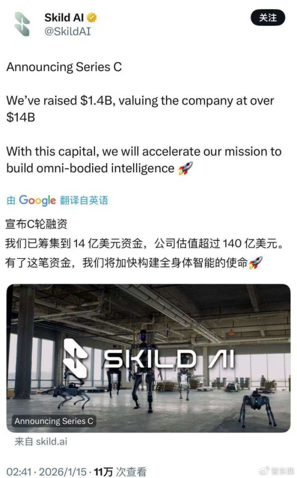 机器人前瞻1月15日消息,今日,美国机器人初创公司Skild AI宣布完成约14亿美元(约合人民币97.6亿元)的C轮融资,估值升至超140亿美元(约合人民币976.3亿元),达到7个月前的3倍。
